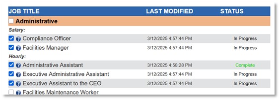- In progress – this position has some data entered but is not submitted and will not be included in survey reports. To be sure to include these data, you must go into the position and click “submit.”